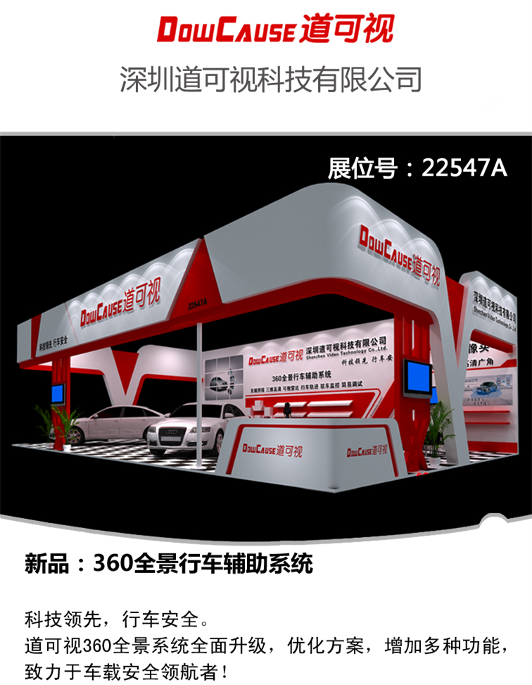 2015年1月16日,第十一屆深圳國際汽車改裝服務(wù)業(yè)展覽會(huì)盛大開幕,迎來了國內(nèi)各地的參展商和采購商。深圳道可視科技有限公司精心準(zhǔn)備的各種展品在展會(huì)現(xiàn)場(chǎng)獲得了市民以及采購商的一致好評(píng)。特別是我們的360度全景泊車影像系統(tǒng)備受關(guān)注,受到了各界人士的駐足。這一次我們主要的展品有360度全景泊車影像系統(tǒng)、智能倒車軌跡、專車專用攝像頭。這三類展品是我們公司專門針對(duì)汽車電子行業(yè)設(shè)計(jì)生產(chǎn)的主打產(chǎn)品,不僅在國內(nèi)屬于獨(dú)創(chuàng),在國際上也是具有較強(qiáng)競(jìng)爭(zhēng)力。