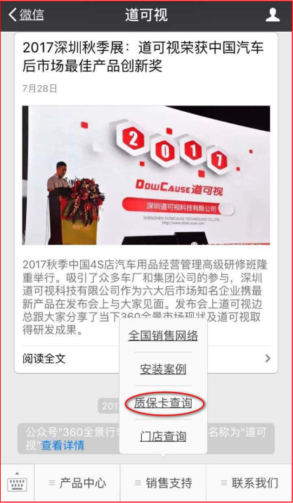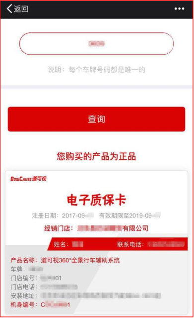 1、查詢產品真?zhèn)?/span>:通過電子質保系統(tǒng)可以查詢到自己安裝的是否是道可視正品360全景,杜絕仿冒產品。