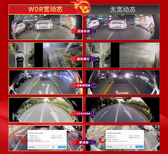 在實(shí)測中,我們將有WDR和無WDR的視頻做了對比,對比發(fā)現(xiàn),有WDR的視頻里,車牌更清晰,盲區(qū)更清晰,夜晚更明亮,畫質(zhì)更細(xì)膩,有效地解決了生活中攝像頭遇到汽車大燈等強(qiáng)光時,畫面曝光、眩光等問題。